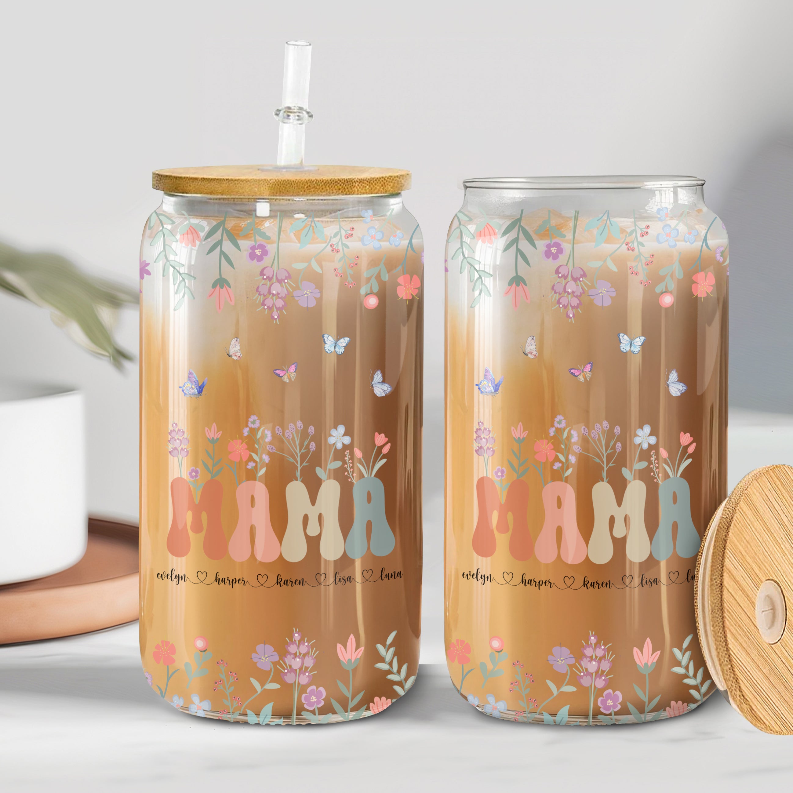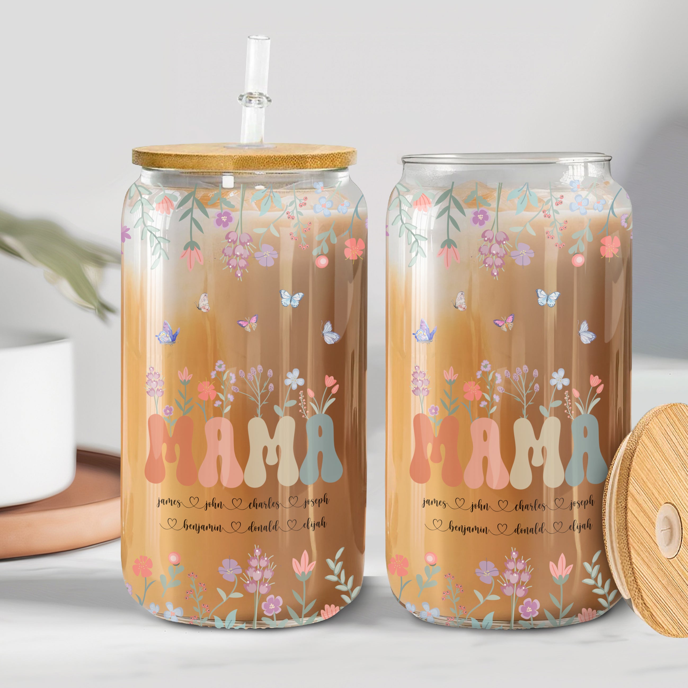 Add a personalized touch to your glassware with the Mama Grandma Mimi Gigi Floral With Kids Names Clear Glass Can. Featuring a beautiful floral design and the option to personalize with your choice of names, this clear glass can is perfect for sipping your favorite beverages. Elegant and unique, it's a great addition to any glassware collection. Capture memories and make them even more special with the Mama Grandma Mimi Gigi Floral With Kids Names Clear Glass Can. This personalized clear glass is adorned with a stunning floral design and the option to add names of your loved ones. A must-have for any glassware set, it adds an elegant touch to your favorite beverages. Experience a unique and memorable drinking experience with this personalized clear glass can.